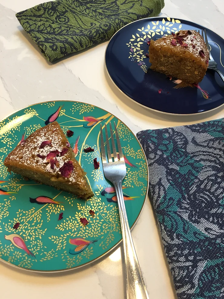 *Once the cake has been removed from the oven and has cooled slightly, poke holes in it with a wooden skewer. Remove the syrup from heat. Add the rose water to the syrup and mix well. With a spoon, pour the syrup over the cake, allowing it to seep into the holes. Avoid the cardamom seeds and pods, but be sure to get all the saffron threads onto the cake - they’re too precious to waste! Garnish with slivered nuts and rose petals. Allow the cake to set for 15-20 minutes before cutting and serving. Enjoy!